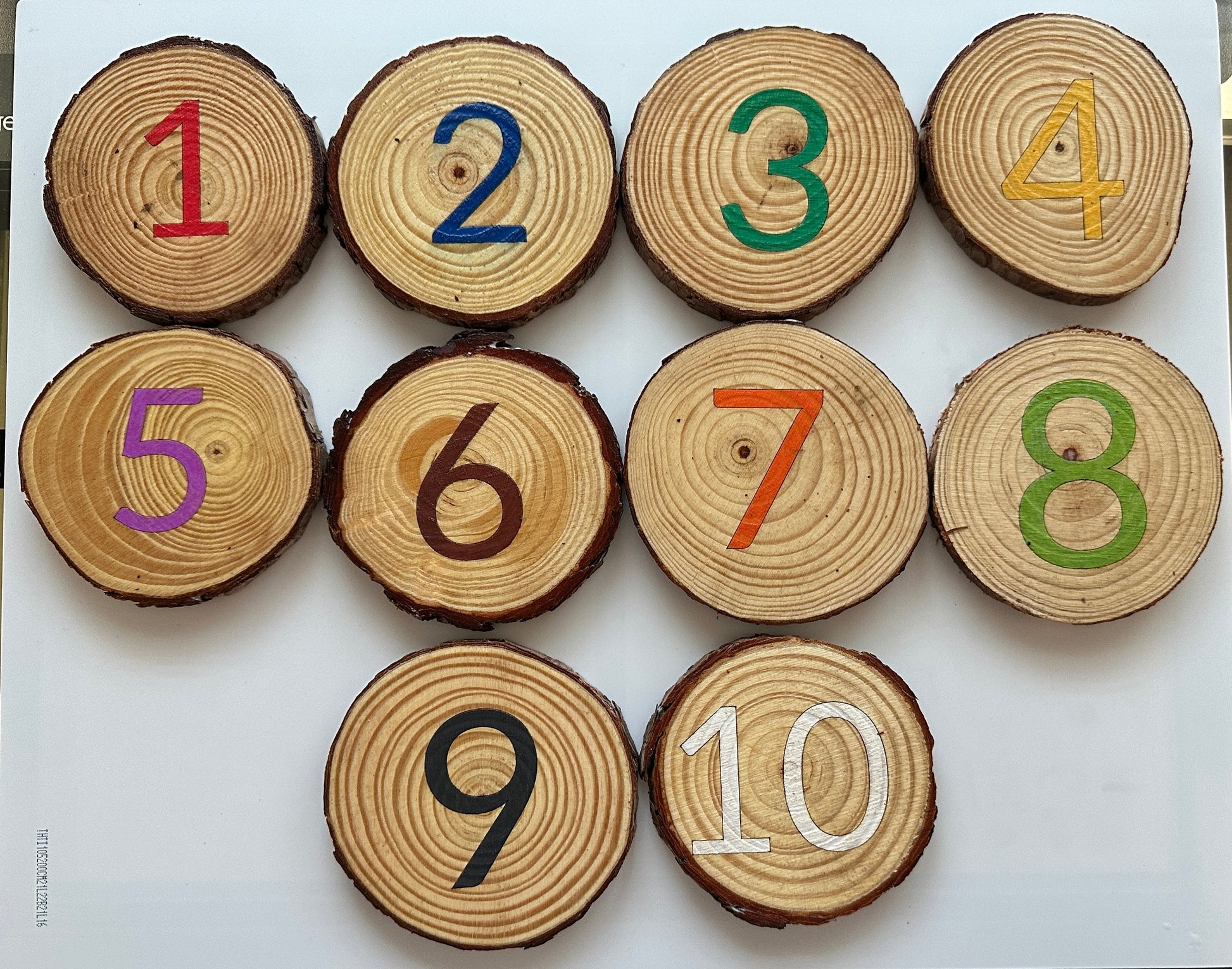 A set of 10 wood slices with number on one side and the number word on the other