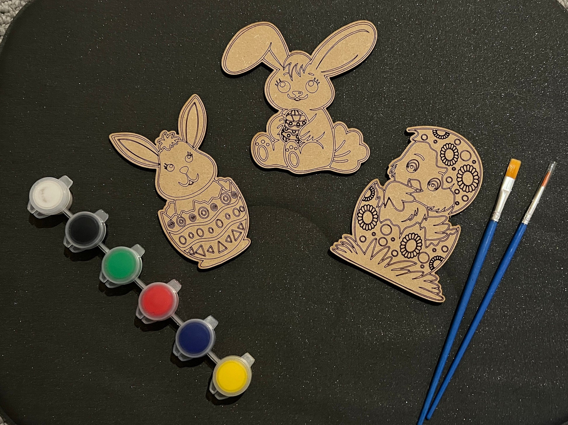 Kit includes 3 MDF cut outs, 6 small pots paints and 2 paint brushes.