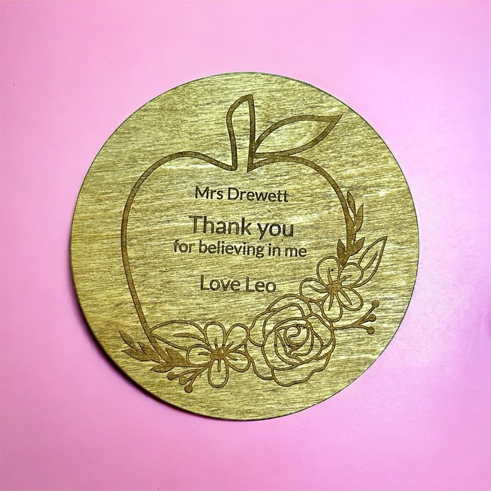 "Show your appreciation for your child's teacher with this unique coaster. Made from high-quality wood, it's personalized with both their names, making it a cherished gift they can keep forever. A thoughtful and memorable way to thank them for all their hard work and dedication. Cheers to great teachers!"